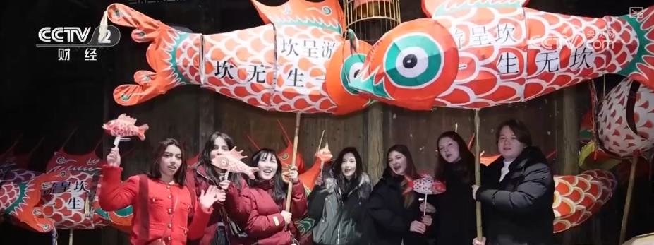 除了在“寰宇超市”尽情购物,番邦游客也会把体验中国的非遗文化纳入春节的行程当中。在安徽黄山,他们可以手抓鱼灯,参与到鱼灯巡游的队列。或是在老诚的提醒下,亲手画图鳞片,制作一个属于我方的鱼灯。