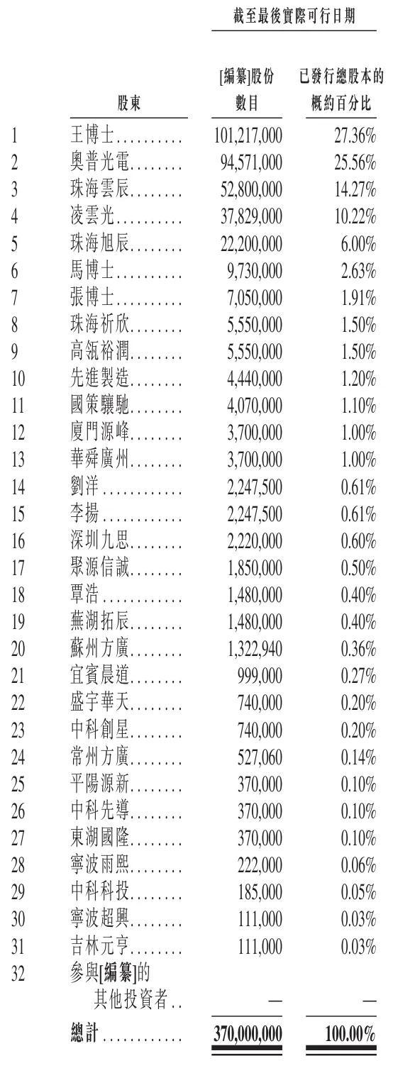 王欣洋博士执股27.36%,奥普光电执股25.56%,珠海云辰执股14.27%,凌云光执股为10.22%,珠海旭辰执股6%,马成博士执股2.63%,艳霞博士执股1.91%,珠海祈欣、高瓴裕润差异执股1.5%,先进制造执股1.2%;